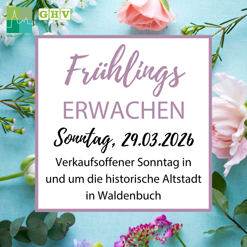 Erleben Sie das Frühlingserwachen 2026 in Waldenbuch! Am Sonntag, den 29. März 2026, von 12 bis 17 Uhr, öffnet die historische Altstadt ihre Türen für einen besonderen verkaufsoffenen Sonntag. Freuen Sie sich auf ein buntes Programm mit zahlreichen Ständen, spannenden Aktionen und unterhaltsamen Events für Groß und Klein. Entdecken Sie lokale Produkte, genießen Sie kulinarische Highlights und lassen Sie sich von der fröhlichen Frühlingsstimmung verzaubern. Ein perfekter Tag für Familie, Freunde und alle, die den Frühling feiern möchten!