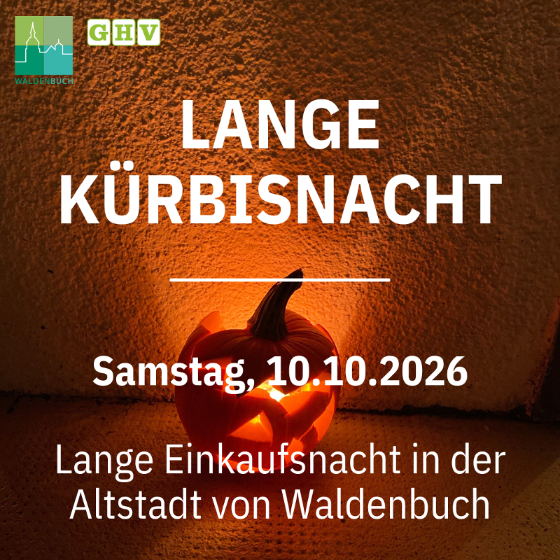 Erleben Sie die Lange Kürbisnacht 2026 in Waldenbuch! Am Samstag, den 10. Oktober, verwandelt sich die historische Altstadt in eine stimmungsvolle Einkaufs- und Eventmeile. Freuen Sie sich auf vielfältige Stände, spannende Aktionen und besondere Angebote in den Geschäften, die an diesem Abend bis spät geöffnet haben. Genießen Sie den herbstlichen Charme, entdecken Sie saisonale Produkte und lassen Sie sich von der besonderen Atmosphäre der Kürbisnacht begeistern – ein Erlebnis für die ganze Familie!