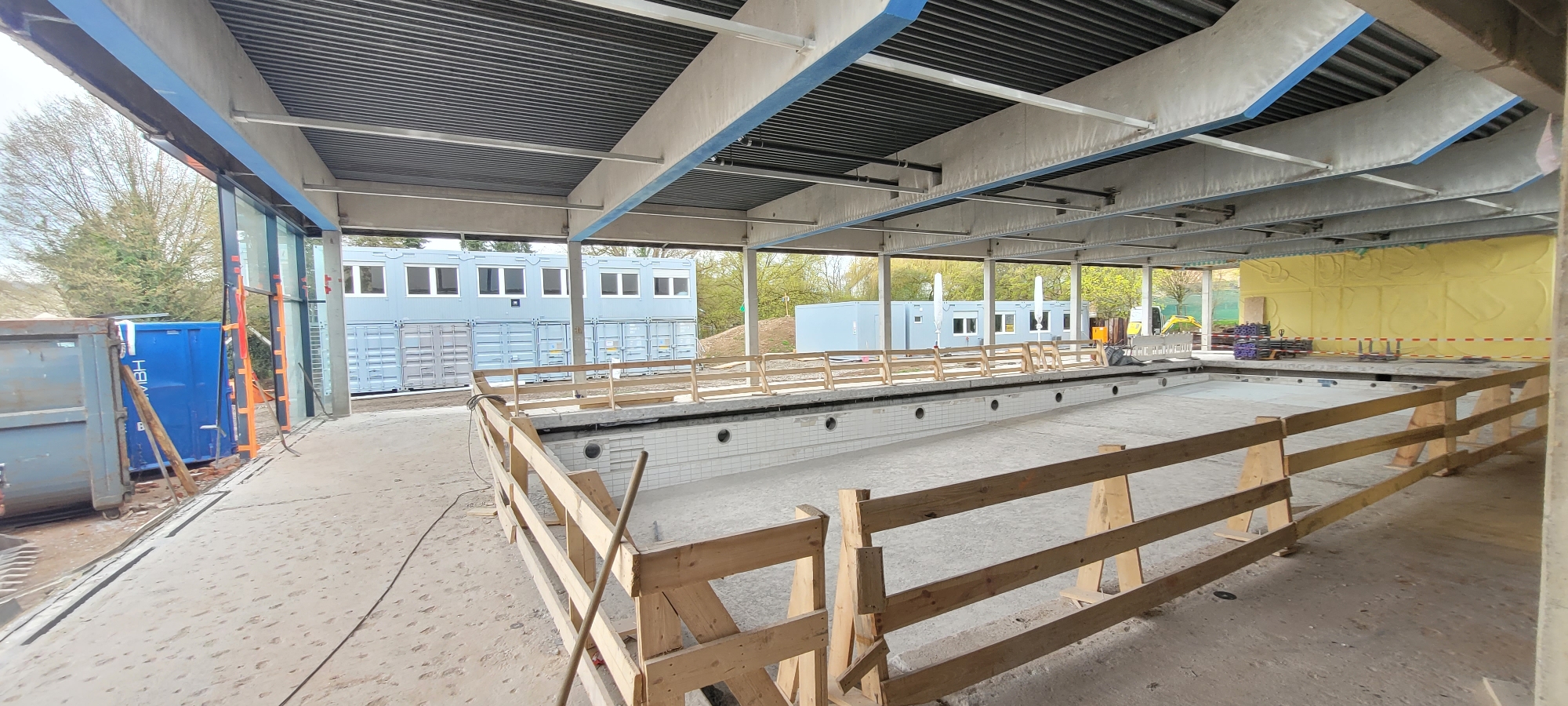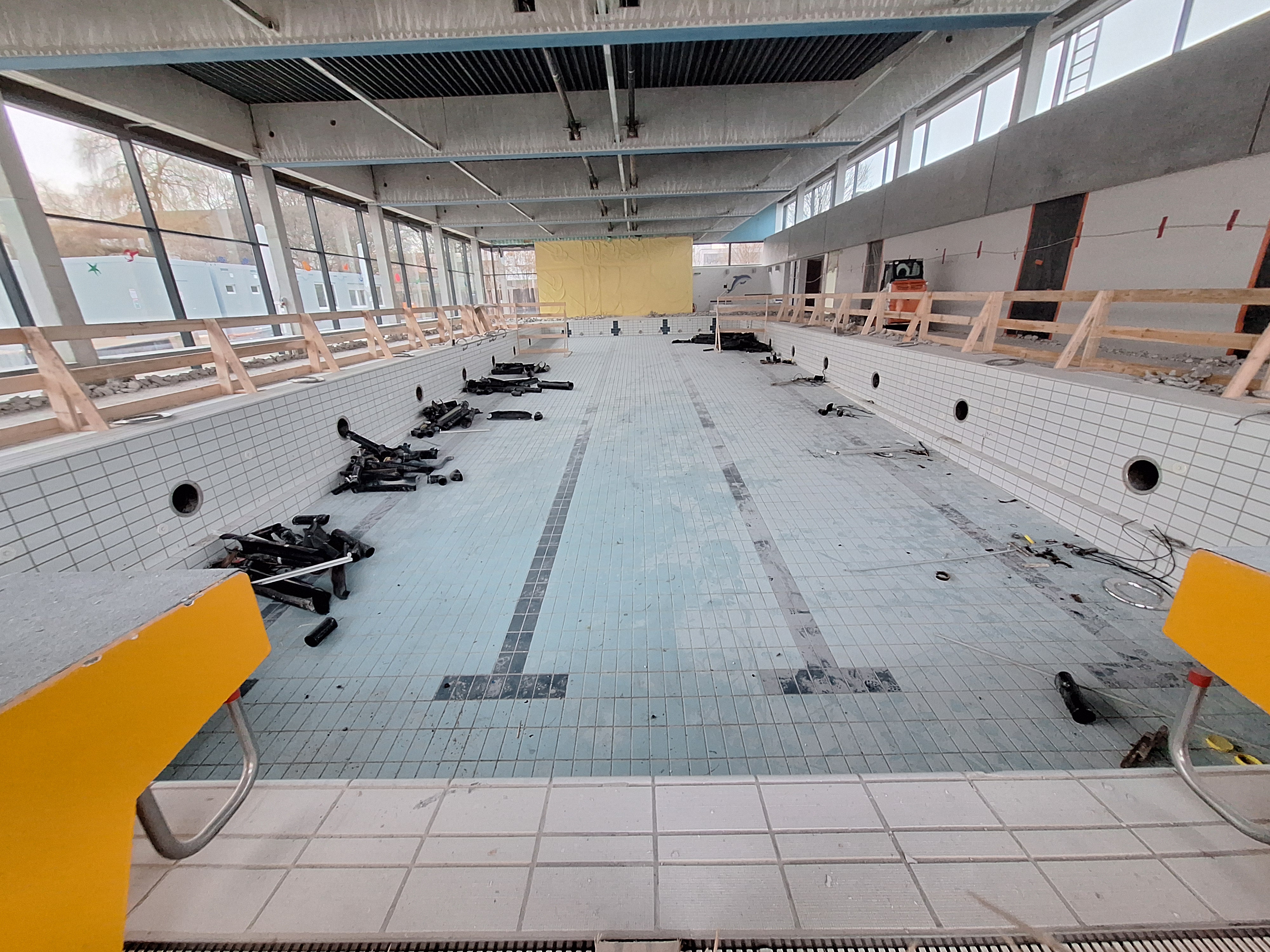 In der Zeit wurde alles aus dem Hallenbad ausgeräumt, abgebaut und eingelagert, was nicht mehr benötigt wird. Im Hintergrund laufen viele Besprechungen und Vorbereitungsarbeiten.