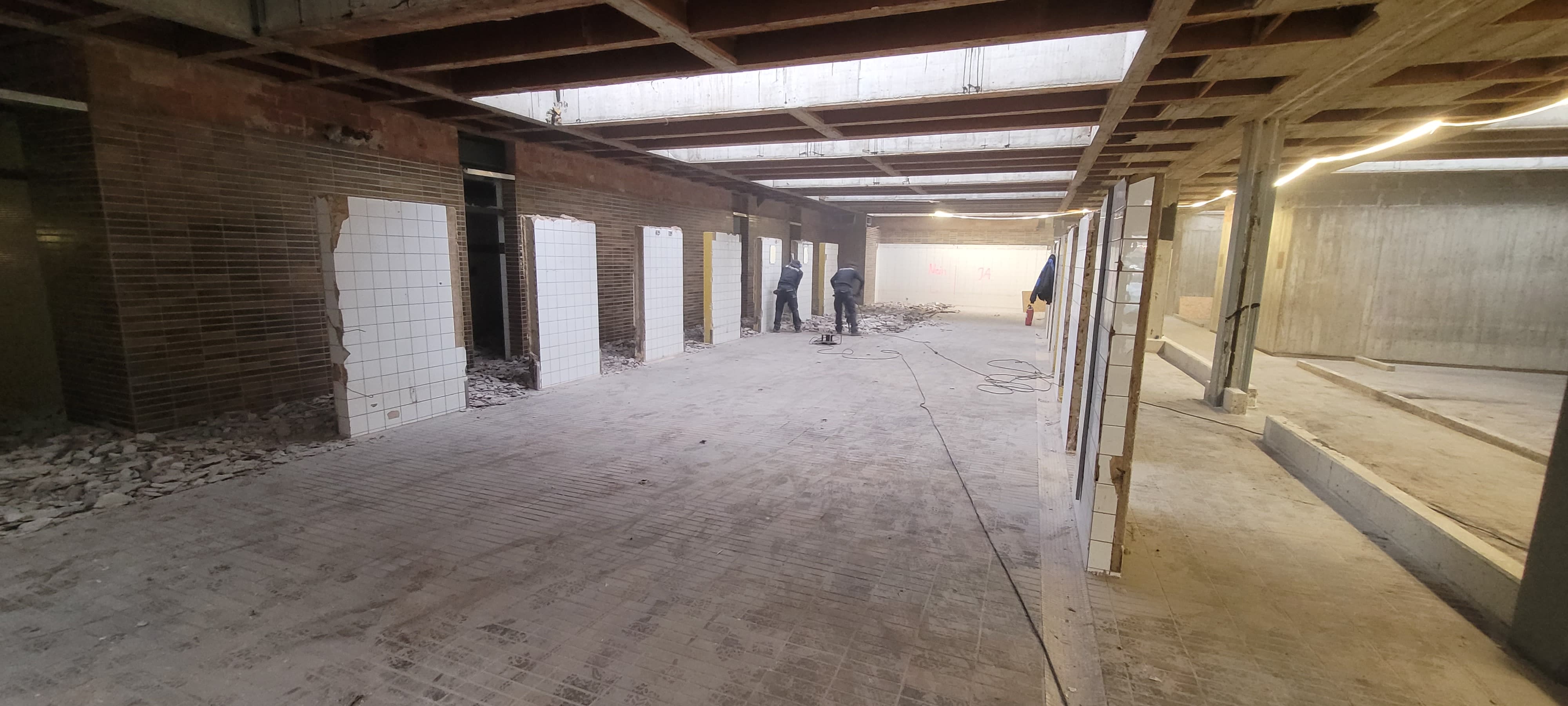 In den Wochen wurden in der Schwimmhalle weiter der Bodenaufbau abgebrochen und die Umkleiden der Schwimmhalle und Turnhalle wurden abgebrochen. In der Technik werden die Rohre und andere Einbauteile abgebaut. Das Schwimmerbecken wird weiter abgebaut. Die Abbrucharbeiten kommen weiterhin gut voran und der Zeitplan wird sehr gut eingehalten.