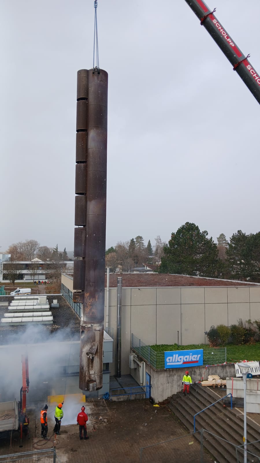 In der Woche wurden die alten Leitungen von beiden Gas-/ Ölbrennern zum großen Kamin abgebaut. Da ein Brenner stillgelegt wird, wurde nur von dem einen Brenner aus eine neue Leitung samt einem neuen Kamin gebaut. Am Freitag konnte dann der neue Kamin in Betrieb genommen werden.