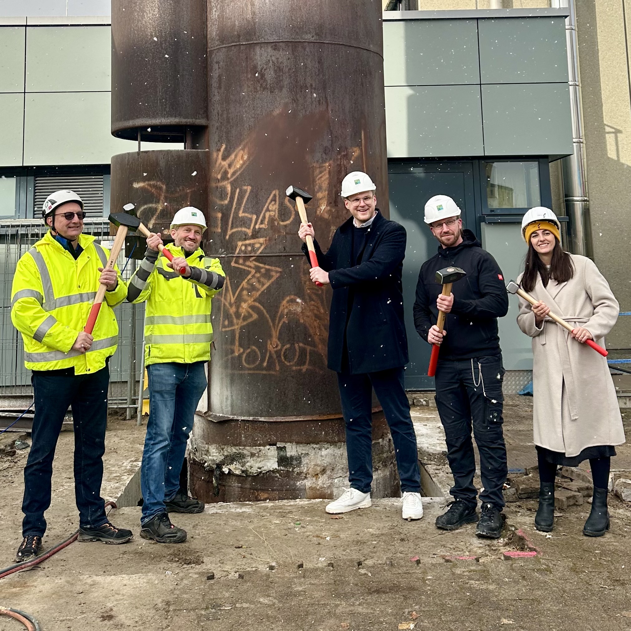 In der Woche wurden am Montag die ersten Container für die Baustelle mit einem großen Kran aufgestellt. Am Montag wurde ebenfalls um den Kamin die Betondecke aufgesägt den Kamin abbauen zu können. Am Mittwoch wurde der Kamin dann mit einer Hubbühne und einem Schneidbrenner für den Abbau vorbereitet. Am 20.11.2025 war es dann soweit für den offiziellen Baustart des Hallenbades. Nachdem der Kamin an dem großen Kran hing, wurde der Kamin mit Hammerschlägen verabschiedet und der Baustart offiziel gestartet. Mit Musik wurde der Kamin im ganzen aus dem Boden gehoben und auf einen LKW gelegt. Dieser ist dann mit dem alten Kamin weggefahren und er wird an anderer Stelle dem Werkstoffkreislauf wieder zugeführt.